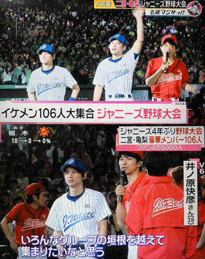 昨日は午後休して、4年振り開催という「みんなにサンキュー ジャニーズ野球大会 東京ドームに全員集合」に参加。結局ドームに入場したのが5時ちょっと前になっちゃったので、入った時には、ちょうどJ-Whiteの練習終了直前。席は外野&J-Redの方なので、Whiteだった光一やマサが遠いし、みんなの後ろ姿しか見れないし、あまりコッチに来てくれなかったんで、ちょっと残念でしたが、楽しんできました。マサ始め、シニア組、大活躍でしたしね。隣が嵐ファンだったせいもあるのかもしれないけど、一番声援が大きく聴こえたのがニノだったかなぁ。スペシャルゲストという名目で、出場グループの、出演が発表されてなかったような、他のメンバーが次々出場し、結局KAT-TUNは全員集合だったもんね。コレはちょっと、自担が出ないと思って、申し込まなかったファンの人には可哀想なような…。解説席では野球実況フリーアナ(梅田淳さん)に、立浪&元木という解説者と、ゆっち、上田くんが中心にMCしてたけど、何となくグダグダになっちゃいそうなところを、ガッと盛り上げてくれたのが、最後の方(4回だっけ?)に現れたイノッチ!さすがの数々のコメントに、会場爆笑で、ついでに選手も爆笑で、楽しくなった~♪