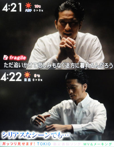予想通り、明日はMVが見れそう??達ちゃんが「新曲を語る」っていうんだから、「ZIP!」でも見せてくれるよね!?そういえば、MVがどんな感じのものになってるか、誰も何も語ってくれてない(よね?)ので、まっさらな気持ちで見ることになるんだね~♪アクアに「TOKIO」って載ってるから、ココが一番早いのかな?後輩Gのように全局で流れるって事はなさそうだけど、出来るだけ長い時間、OAして欲しいです。そして、CXの局アナ、自分の局のドラマなんだから、主人公の名前を正しく言ってよね…(;一一) 。リーダーの名前も正しく言えなかったりね…┐(-。ー;)┌