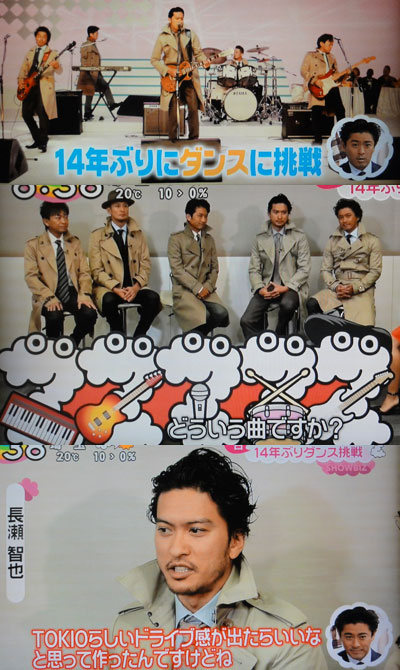 それぞれターニングポイントになった曲を挙げて行くが、まず達ちゃんが「どいつもこいつも」。レコード会社移籍ということで、ダンスをMVでするという新しいことが出来たと。達ちゃんが「レコード会社の移籍はファンには判らない」って言ってたけど、全然そんなことはなくて、やっぱりユニバーサルに映ったからこそ、TOKIOの音楽性が、アイドルが歌うような曲から、応援ソングに移行し、いろいろやれたことがあったから、大きい出来事。関係なくない出来事。マボがMVの監督やったのも、そういう事だし。というので、トラG MVの話題。言われてみれば、2004年春だから、智也も25歳と若かったから、そんなジャニタレさんが、水着の女性たちとベッタリっていうのは、通常考えられないワケでだけど、それを出来たのもTOKIOだからだね。続いて太一は「みんなでワーッハッハ」を選び、つんく♂さんとの出会いの事。それまでも、作家陣には、アーティストもいたし、それなりの人たちに作ってもらってたけど、きっと、つんく♂が初めてなんだろうね、レコーディングまで立ち会ったのは。それから、宙船や雨傘みたいに続いていくんですが。そして智也が選んだのは「リリック」。理由は思った通り、これからのTOKIOのスタイルが始まった曲だからね。「人っていう温かさを描けた」って、嬉しそうな顔で喋る智也に(*ё_ё*)きゅん・・。そしてリーダーは「明日を目指して」。これもリーダーらしい選曲だよね。もちろん、メンバー作初シングルだから。この時のトキステでも、ずーっと言ってたもんね、メンバー作初のシングルって。さすがだわ。最後にマボが選んだのは「東京ドライブ」。20周年で「TOKIOは終わった」ちょっと語弊があるけどね。言いたいのは、新たな気持ちで「LOVE YOU ONLY」のような気持ちでと。「LOVE YOU ONLY」で始まり、49作めの「LOVE, HOLIDAY」で、「LOVE」でまとまったということで、チャンチャンと。