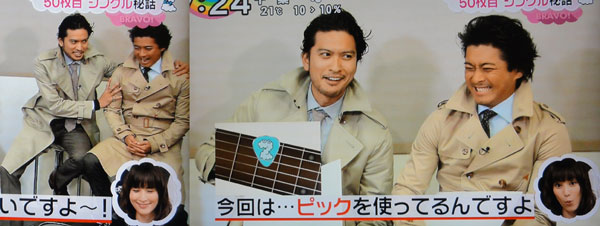 実は、Mステも、あんまり、しっかり見れてなくて(^▽^;)、でも、サッと見た感じでは、やっぱりパフォーマンスは楽しいよね~♪早くLIVEで堪能したいー!そして、今日は、ブランチとCDTV。前回、ブランチのプロモがなかった(よね?)ので久々。「東京ドライブ」だけじゃなくて、「I believe」もメンバー曲として、ちゃんと、流してくれたし、太一の想いも聴いてくれたし、ヨカッタ♪で、サッサと新曲の話が終わり、太一が結婚祝いでもらったプレゼントのことに。会見でリーダーにもらってない発言したことから、すぐにリーダーがプレゼントをあげたそうで。「ゴメンね、催促したみたいで」と太一が謝ってる(*'ー'*)ふふっ♪趣味の畑仕事に役立つような、小さい耕耘機。さすがだよね。智也が「あ、趣味がね~」ってすぐ反応するのがメンバーだよねぇ。達ちゃんは、ZIP!でも言ってた、ポップコーンマシンで、マボのプレゼントになった時に、「松岡くんは、もう、…松岡らしかったな」と言われ、ニヤリとするマボ。「パーンとね」っていう言い方したけど、もしかして、現ナマかしら?年末の後輩とのプレゼント交換の時、欲しい物をあげる主義って言ってたし。「オレと松岡の秘密」って言われて、智也が「え~、ナニ~!?」可愛い…♪で、智也ですけど、「そういえば、長瀬から、何ももらってないよね」とオドロキ発言。あげてなかったのは、リーダーだけじゃなかったんじゃん!智也は「(メンバーの話)ずーっと聴いてて、アレ?オレ、ナンか、あげたっけなぁ?ってずーっと思ってて」というので、メンバーも大爆笑。で、「何が欲しいっすか?」と、ふんぞり返って言うから、マボにツッコまれてるし!このインタビューがいつぐらいか、判らないけど、もう渡したのかなぁ? 続いて、メンバーの理解できない行動についてという事で、太一が「リーダーが、仕事現場にはTシャツ・スゥエットで来るのに、終わって、帰宅して、スーツに着替えて食事に行くのが理解できない」って。普通は逆でしょ?と。リーダーは「40歳過ぎたら、背広着てないと締まらない」と答えたら、ブランチレポーターの女の子が「背広???」となって、背広の意味が解らないというジェネレーションギャップ判明。19歳ということで、TOKIOがデビューした時には生まれてないと。するとレポーターの子が「そうです、ヨボヨボです」というので、「ヨチヨチでしょ」と。そこで、さすが、TOKIO!一斉に「ヨボヨボはコッチ」と、リーダーを差してます♪おあとがよろしいようで…☆彡