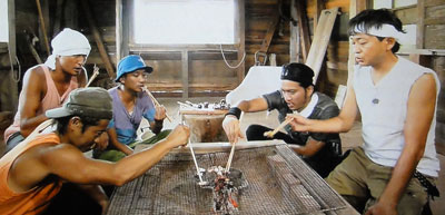無事タコをゲットして舟屋で用意してるトコに、達ちゃん父さん合流。ホントに、お勤めから帰ってきたお父さんって感じに貫録たっぷりに登場するんだもん!そして、5人で一緒に、同じ物を食べて、今後の作戦会議(?)。いいよぉ~、サイコーだよぉ~!もっと5人での姿を見せてよぉ~!