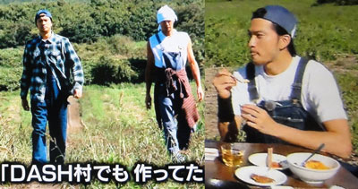 北海道の自然の中を歩くツインタワーは、ナンて絵になるんでしょう♪錆好きな智也が、熟成したカボチャの柄がカッコイイっていうのは納得かな。ツインタワーのシンクロが素敵♪糖度計の数字を見て「「わぁーっ!」」「「23.7度!」」と、ステレオ放送で、最後に一緒に指差してるし!収穫時には、いつものように語り掛けちゃう智也♪出張DASH村は、お手伝いメインから、満点青空レストランみたいになっちゃってますね、最近。実際、ロケでは、きちんと作業をお手伝いしているんだろうけど、使われるのは、美味しいモノ作って、食べてるトコ。ま、農家さんにとっても、手伝ってもらえる事には限りがあるから、それよりTOKIOに、作物がオイシイって事を、大いにアピールして、購入量が増えてくれる事の方が、ありがたいことなのかもなぁ。一生懸命、美味しい物を作ってくれるもんね。いつもより、チカラを入れて、おもてなしのスィーツ、作ってくれるんだもんね。智也は正直だから、一番美味しそうに食べてるのが、プリンなんだもん、奥さん、喜んじゃうよね~♪