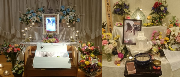 本日午後2時。クオレとお別れしてきました。専用の葬儀社で、ちゃんとクオレ用にも青い数珠を用意してくれて。はめるのに持った足は、肉球はぷにゅぷにゅしてるし、毛はふさふさだし、生きてるみたいで。火葬場で台に乗せるのに抱き上げた体は冷たかったけど、やっぱりフワフワで、体の重さを感じると、もう亡くなってるなんて信じられなくて、扉が閉められちゃうのが、ホントにツラくて、もうあの姿に逢えないと思うと号泣で。火葬が終わって、尻尾の骨まで綺麗に並べられた骨に驚いちゃった。