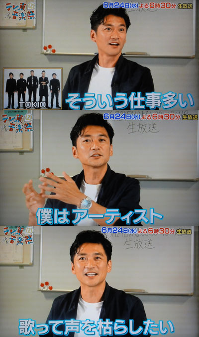 紅白以来のTVでのパフォーマンス(だよね?)、さすがに去年ほどのパワーを感じられなかったけど、ステージでは出演者中、一番盛り上がったと、ひいき目かも知れないけど感じました。ま、バンドスタイルで出たMusicianが少なかったからね。テレ東の、TOKIOに対する思い入れも、バックに出て来た、メンバーイラストに感じたし、最近、リーダーが20周年の時のような色気を感じなくて、ちょっとガッカリしてたけど、Guitaristとして、そしてファンがいてっていう中では、やっぱりカッコいい~♪途中のギターソロで、大橋アナの横に座り、エロテロGuitaristとして、悩まし~い目線送ってるのは、さすが!ブラウスの胸元と相まって、SEXYだったなぁ~☆この時のマボの表情が見たかった!去年も思ったけど、やっぱりMusic DAYよりテレ東音楽祭の方が参加したいよね、MCを太一がやる限り。日テレのは、MCのグループがメインになるもんね。番組表で、ナンで2つに番組が分かれてるんだろう?って疑問に思いつつ、両方予約したのに、1台のレコーダーは途中からしか録画出来てなかった!もう1台の方は、ナンか胸騒ぎがしたから、番組表の時間を操作して、前後に余裕を持たせたんだよね。偉いぞ、私!参加した方々のお土産話を拾い集めてないから、CM中がどうだったのか、本番でも映ってないトコはどうだったのか、気になります。昔はいろいろレポしてくれるファンサイトが結構あったけど、今はツイで、あっという間に流れてっちゃったり、仲間内のLINEだったりで、なかなか目にすることがなくて寂しんだなぁ…。私も昔みたいに、いっぱいレポ書きたいんだけど、参加出来てないからね…|||(-_-;)||||||