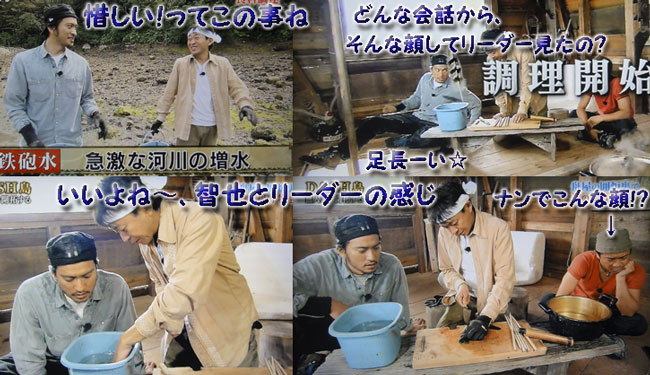「リーダースゴいね~」「穴、いっぱい開いてるも~ん♪」「穴っぽこホジホジ作戦!」と、小さな石の上にちょこんと座り込んでる智也が、言い方も可愛いけど、佇まいも可愛すぎるっ☆テッポウエビを「ピストル・シュリンプ」って言っちゃうのも智也らしいし、匂いにクンクンいち早く反応するし、食べてみれば「あぁっ!」「うめぇ!」「甘ぇ!」と、ホントに楽しい。きっとそんな智也を見てる2人のお兄ちゃん'sも、チョー笑顔だと確信!そんな美味しいもの食べちゃった後だからか、茹で上がったオオヘビ貝を叩き割ってる時の、ビミョーな表情が笑える(#^m^#)。そして智也と達ちゃんとの譲り合い。流れ着いたものを、試そうとするくせに、こういうのはダメなの?達ちゃんは。達ちゃんには逆らえないから、結局智也が最初に口にするんだけどね、前回のお茶のように。でも、お口に合ったようで、ヨカッタです(#^.^#)