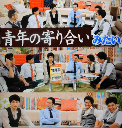 やっぱり、こうやって、普通にトークしてればいいじゃん!チョロッとネタを振れば、こんなにボーイズトークが弾んじゃうんだから。平均年齢40歳以上でも、カワイイよね~。達ちゃんに「やればいいのに!」って、腕をぴょこぴょこさせて、力説する智也が可愛すぎる!そして、甘えを認めてないような達ちゃんに「カッコつけたがる!」と、ツッコむ智也が、ステキすぎるぅ~!それにしても、かなりぶっちゃけましたけど、これもTOKIOだから、ほのぼのとするんだろうな。顔を赤くしながらも、リーダー巻き込んで実演するマボ。リーダーは、さすがって思える、ひと味違ったトコで表現してたし、太一も、らしいなぁ~っていうエピソードで、そしてそれはやっぱり智也のツボで、今日イチ笑ってたよね(* ̄m ̄)プッ。達ちゃんも、自演して、自分で照れちゃってるし、それが、達ちゃんらしいし。智也は髪の毛と耳たぶ。これも納得なんだけど、それよりも、「女性の柔らかいところ」を求めてるって言ってることが、やっぱりね~って思うんだな。肉付きいい方が好みでしょ??