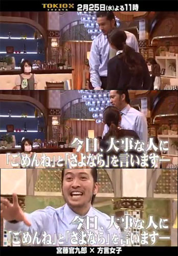 番組では、「付き合って5年目のイケメン彼氏と方言彼女。彼女の自宅でまったりしていると彼女がツンデレに…」「仕事終わりの居酒屋で、イケメン先輩が後輩方言OLのグチを聞いていると…」など、さまざまなシチュエーションを用意。それらのシチュエーションの中で、ゲストの宮藤をはじめ、TOKIOメンバーはどのようなリアクションを見せるのか!?
