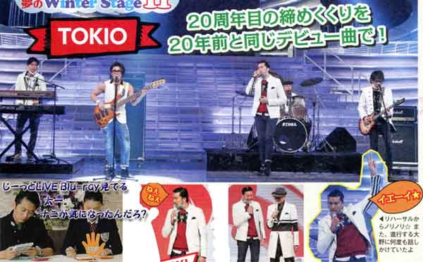 ペンが欲しくて駅ビルの丸善に行き、ついでにアイドル誌立ち読み。そうしたら、紅白記事にTOKIO発見。司会とトークしてるトコとかは、今までいろいろ出てたけど、リハで歌ってるのは、1誌、1日目?に、私服で歌ってるヤツしかなかったと思うので、お持ち帰りしちゃいました。このジャケットだけ衣装の5人を見てると、コレはコレでありかも?という気がしますねぇ。ま、それより完全私服姿の方がカッコイイ~って思えますが。