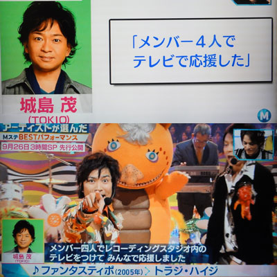 気になってた、ファンタスティポのテレビ応援(?)の事。2009年9月30日大阪LIVEでのMCでした。マボがMステでTHE SHIGOTONINとして歌った話から、リーダーが思い出して話してくれたんでした。つづきスタジオでリハやってる時に4人で見てたって。「太一くん、緊張してるね」ってマボが言ってたとか。達ちゃんはマボ出演のMステ見てて、「意外とMC、緊張してるな」って。ちゃんと見てるんだよね~♪