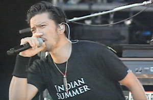 そして、時間になり、歓声が上がって、登場してきた智也の姿を見て、もう、倒れそうでした。ミラーのサングラスに「INDIAN SUMMER」とロゴの入った黒Tシャツに黒パンツ、エンジのVANSスニーカー、胸にはいつものネックレス。何より悲鳴もんだったのが、オールバックだけど、軽くパーマをかけて前髪をフワッとさせ、サイドも軽く流してセットされた、クロコーチ前のヘアスタイルに似た感じだったこと!うっすらヒゲもあったので、スゴく精悍な感じがバリバリで、そして何より、とっても落ち着いた雰囲気がしてみえた。手を広げ、場内をゆっくり見回し、この空間を体に取り込んでる感じ。ナンかスゴくドキドキした。