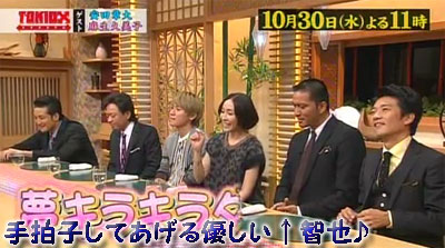 歌う麻生さんに手拍子してる智也がステキだなぁ~♪こんな素敵な智也は、一体、どのように管理してるんだろう?と思うくらい、お祝いのお花を贈ってるんだなぁ。今まで一体、いくつの花を見ただろう??SIAM SHADE懐かしい~♪私が大好きな「Crazy Chase」(Over 30's World Versionが特に)作ってくれたけど、メンバーのBiographyをあらためて観たら、アメ車、ハーレー好きな人がいるじゃん!もしかしたら、現在進行形の親交だったりするのかなぁ?智也の交流関係も、ホントに多種多様で、驚いちゃう。ゲストは安田章大(関ジャニ∞)と、麻生久美子。TOKIO5人との共演は初めてで緊張気味の安田。さらに、麻生のタレコミで発覚した“KY行動”を先輩にツッコまれてタジタジ!?家にいる時のプライベート秘話まで暴露されて赤面。一方麻生はモノマネしたり生歌を歌ったりと余裕。松岡昌宏から「こんなに盛り上げてくれてるのに、ウチの後輩はナンなんだ!?」とダメ出しが…。