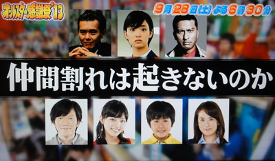 意図しなかったハズだけど、ちょうど台風襲来の時に「雨にも負けず風にも負けず残暑にも負けない」っていうタイトル。3時間って長いね~!6ネタ(?)あったんだ。裏を意識しての3時間だったのか、どうか判りませんけど、3週間も無いことを思うと、長いスペシャルより毎週のOAの方がいいんだけどな…。智也の出番が、思った以上に少なかったから、そう思うのかも知れませんが。バンキシャ出演のリーダー、ヒヤヒヤしながら見ちゃいましたよ。TOKIOのリーダーとTOKYOのリーダーご対面。猪瀬知事もちゃんとTOKIOは理解してくれてるようで嬉しかったな。そのヒトコトのおかげで時間がなくなって、アップアップしちゃったリーダーがDASHスタッフにはウケたらしく、ヨカッタです(*'ー'*)ふふっ♪
