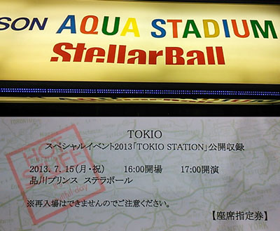 で、腹ごしらえして、いざ集合場所へ。この炎天下、待機場所は屋内、あるいは、日陰になるところだろうと思ったら、会場がある入口を通り過ぎて、その奥の駐車場ですよ!それも番号順に並ぶのではなく、ざっくりと、QRコードペア申込みエリアとシングル申込みエリアに分かれてるだけ。ハガキ組は、駐車場の手前の木陰なのにぃ…。で、1番から呼び出すから、それまで待てと。最初は10番、20番単位が、100番になり、50番ずつになって、そして全然番号順じゃないじゃん!GIGの時も雨降る中、グダグダで入場になっちゃったんだったと、思い出しました。PA席?カメラ席?前の最後列だったけど、ほぼ正面。会場に入って、すぐにステージにバンドセットが置いてあったので、テンションがグンッと上がりました。トーク用のテーブルがあって、4人が向き合い、一人お誕生席があるから、そこが太一かなぁと。上手側に座っちゃうと、横顔しか見れないかな?と思ったけど、リリックが流れ、太一から「宜しくお願いしまーす」とぞろぞろ入ってきて、座ったのは、前回のTOKIO STATION(屋形船版)と同じように、下手側に智也が客席に近い方、その隣にリーダー。向かい側が達ちゃんで、客席側がマボ。なので、智也の顔はよーく見えました♪肉眼でも十分だったんだけど、後ろにスクリーンがあって、全体映したり、5コマにカット割りしたりと出てたので、双眼鏡の出番は1回、2回だけかな。トーク内容については、DVD収録ということもあるので、あまり触れない方がいいかなと。ま、いろいろネタバレ出てますけどね。アンケートを元にトークが進んでいくんだけど、ホントにTOKIO STATIONを見てるって感じ。DVDで見てるのと、同じTOKIO。智也のファルセット笑い声が何度も聴けました。マボと同じくらい、立ち上がったり、いろいろ動いてましたね。ナンか、TOKIO全員、痩せてない?