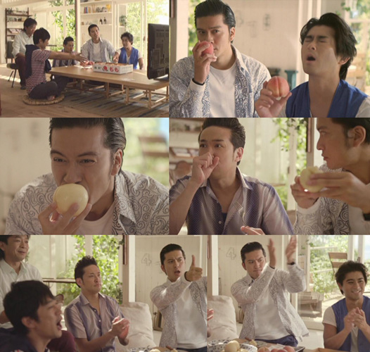 中旬からOA開始って事で、今日から桃バージョンが流れてます♪メンバーが一つ屋根の下にいるって感じ、フマキラーのCMみたいだけど、ナンか嬉しいなぁ~♪桃農家さんからのビデオレターを見てる体なのかな?桃をクンクンしてるのは、やっぱり智也(*'ー'*)♪とーっても綺麗に剥いてある桃、ホント美味しそう(⌒¬⌒*)♪桃にガブリの智也、ナンか人相が違って見えるなぁ。「美味しかったですかぁ?」という問い掛けに賞賛の拍手を贈るTOKIO。たくさん流れるようになって、またいろいろ言われるんだろうな…。