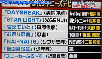 そうだよね、忍者ってバリバリ踊ってたんだよね~。全員でのパフォーマンス、きっとカウコンのようになるんだろうなぁ…。TOKIOが一番年長さんだけど、やっぱり一番はっちゃけちゃうだろうし。案の定、リハで全然踊る気もなくハシャぐチームありって…、ん?やっぱりTOKIOも踊るっていう事なのか!? 忍者ばりのダンスは、今のTOKIOはムリでしょ!?