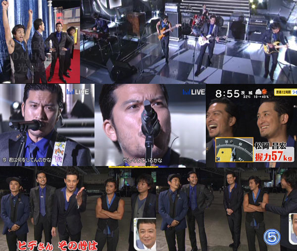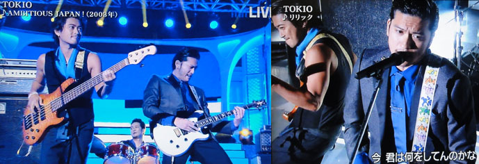 すぐ出てくるのかと思ったら、結構待たされたましたね~。いきなりの太一ヘン顔に、全員ヘン顔シリーズか?と思いきや、やっぱり追随したのは智也だけ(^ー^* )フフ♪この、7秒しかない枠で、徳島アナに「5人の中で誰を選ぶ!?」と聴いちゃうマボ。ほぼ即答で「達也さん!」だったのは、しょうがないねぇ~、元ZIP!ファミリーだもん。智也が仁王立ちなのは、選んで欲しかったっていうアピール?紹介されて登場する時、ちゃんと打ち合わせしてないから、智也のポーズ、見切れちゃったじゃん!自由すぎる。この歌の衣装、大好き♪太一のキャップがなければ…!今、TOKIOの美ジュアル、いいよね~。達ちゃんが最近綺麗なのは思ってたけど、マボも痩せたよね?バスドラ、鳴るのが大好き!ココを映されるって、珍しいよね~♪ありがとっ☆久々のパフォーマンスだからか、スゴく、みんなノリノリで、もう、見てるのがツラいです。ナンでこの場にいられなかったの?って。「ありがとぉ~!みんなの声援、気持ちよかったぜ~♪」LIVEで聴きたい言葉だなぁ…(;_q))
