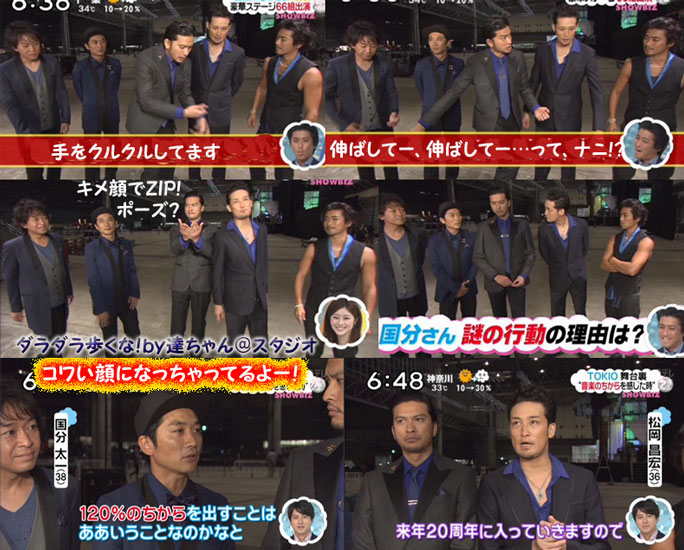 マボ、「ZIP!」ポーズで、歌わなかった事、専務に怒られたって言ってたけど(スッキリ!ではマネージャーに言われたって言ってましたね?)、最後のヒトコトは大丈夫だったのかしら?アレ、よく聞いてると、2回目は智也っぽく聴こえるね!?【あのシーン、マルチアングル欲しいっ!智也が奥すぎるんだもん!】太一が全員パフォーマンスで、一人違う動きをしてた理由、CM挟んで引っ張るネタか?