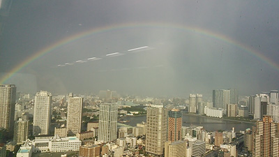 夕方、ふと気付くと、みんなが窓に張り付いてる。ナニ!?と思ったら、綺麗な虹が出てました。最初は薄かったのに、どんどん太く、綺麗になっていったので私も思わず。会社の蛍光灯が映り込んじゃったけど、こんなに綺麗な虹を映したのは、初めてかも。願いが叶いますよーに!