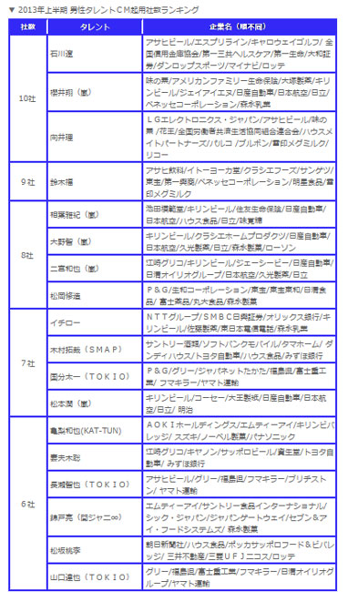 後輩Gが、5人全員が入ってる事を受けて、朝ズバ!に出てたコメンテーターが、彼らに救われてる人がどれだけいるか!と、絶賛してましたが、スマさんは、木村さん一人なんですねぇ~。TOKIOからは3人がランクイン。太一はP&Gが入って、7社だけど、まだ契約続いてるの??全然見ないよ?新作あるのかな?新作と言えば、福島県のCM、桃バージョンがそろそろ来るのかな?OA開始に合わせて、新作ポスターも出るといいなぁ~♪