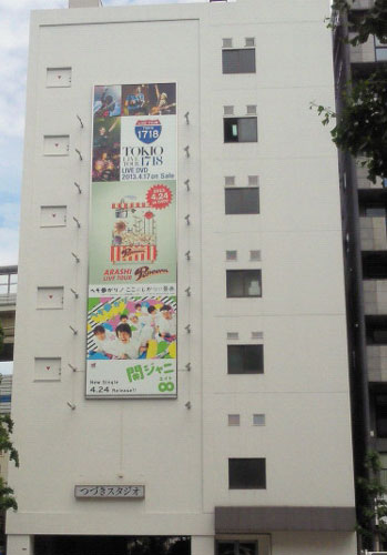 つづきスタジオにTOKIO看板出現ですよ!DVD発売後だよ?いつだったか、記憶があやふやだけど、今年になってから、通った時には、Vとか、ヘイセイ兄さんだったような…?ココにTOKIOの看板出たのを見た記憶がないけど、以前は出てたのかなぁ?いつも他Gばっかりで、( ̄‥ ̄)=3 フンって思ってたけど…。まだよっしーがオーナーなのかしら?玄関前にロケバスが停まってたし、出待ちっぽい女性2名いたから、♪(o=゜▽゜)人(゜▽゜=o)♪誰か来る!?と思って観てたけど、目を離してたスキに扉が閉まる音がして、行っちゃった~。ナンだったんだろ?すると、目の前を男の子が通過してったんだけど、…アレ?須賀健太くん?近影を見てないから、自信ないけど、地下鉄入口降りてったんだよなぁ…。もう18歳なんだっけ?