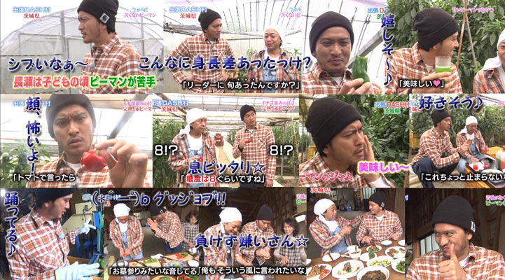 イチイチ、ツッコみたくなる、智也の言動。ビニールハウスに入って「ピーマンだぁ~♪」言わずにはいられないのね~。そして相変わらず、リーダーにはドS智也。きっとリーダーの旬は、これからなんじゃない!?身近な野菜だけど、赤いピーマンは、パプリカとは全然違うものだったとは、知りませんでした。そして、2人とも甘いって表現してたけど、想像出来ないなぁ~。それにしても「糖度8度」で、ピンっとくるアイドル…。お料理も、だんだん板についてきたかな?褒められたいってうらやましがる智也が可愛すぎ~♪肉詰めもいいけど、刻んだタマネギとツナをマヨネーズであえたものを詰めたヤツ。パン粉かけて、オーブンで焼くだけだったけど簡単で美味でした。赤ピーマンジュース、飲みたいな~☆