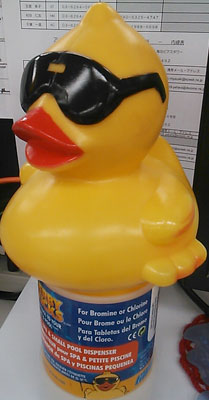 段ボールが届き、開封してた営業マン「あぁ、捨ててもらっておけばよかった」とつぶやきながら、やってきて、「いる?」と差し出した黄色い物体。「悪村長?!」と一瞬びっくり!!しましたが、薬剤を入れてプールに浮かべておくと、中の薬剤が徐々に溶け出していくっていう、フローターと呼ばれるもので、円盤状みたいなのは見た事あったんですが、こういうのを作ってるとは、全然知りませんでしたので、ありがたくもらっておきました。コレを見た時すぐに思い出した、DASH。