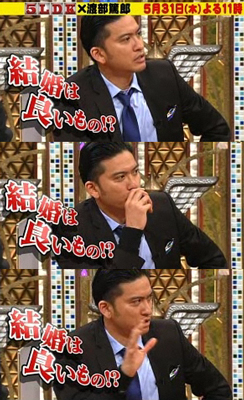 ようやく5LDK版応援スポット、ゲットー!∩(´∀`)∩ ナンでシャンパンタワーがあるんだろ?SPの収録なのかしら?と思ったら、今日発売のTV誌に、珍しく5LDKの記事があって、またまたヒガシ先輩が出演との事(6/14OA)。太一にドッキリを仕掛けるようで楽しみ♪でも、その記事の写真の智也、刈上げ状態がなぁ…。来週のゲスト渡部篤郎さんの横にいる智也が、このスポットと一緒な感じ。リーダーもリーゼントだから。どっちを先に収録したのか、判らないけど、とりあえず、このバレー応援スポットはスッキリリンで嬉しいって事で。でも、ナンで髪の毛短くなったのかなぁ?…水面下ではしっかり動いてるってこと??