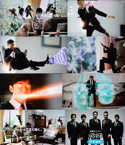 プシューッとしたら、出てくるTOKIO戦隊。それぞれが違う形で蚊と戦うんだけど、マボは殺陣のようにダイナミックだし、達ちゃんは足からビーム、智也はデッカイ手からビーム、そして太一は目と口からビーム。コレ、ホラーじゃん!リーダーがすーっと上がってくるのがカッコイイ~って思ったら、デッカイ手の形したビームで蚊をパシッと挟む、原始的(?)攻撃。最後の「フマキラー!」というショット、一瞬、最新版って判らない、ここ数年の定番。キリリ智也、大好物です♪