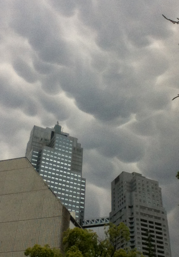 今週は、会社近辺でランチ出来る場所を探し回る日々。天気が不安定で、外に出た途端にゴロゴロと雷がなり、雨が降り出しちゃいましたが、食べ終わった後には、やんでいたので、ラッキー。でも、雲がヘンな模様になってたので、会社のビルをパチリ。引っ越しして初の地震も体験し、やっぱり高層階はヤダー!と実感。