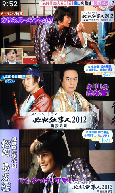 ようやく、製作発表…だよね??(-ω-;)ウーン、主役の(ハズ)仕事人さん達より、悪役さんの方に注目が行っていますが…。ま、スペシャル番組だから、しょうがないね。このスペシャルの手ごたえ次第で連ドラになるかもしれないのかな?大きな穴が空いちゃったから、プレッシャーも大きいしね。それにしても、マボ&聖(&和久井さん)の喋ってるトコないなんてなぁ…。ま、OA近くになったら、リーダーの番組にマボが出るってことを期待しよう!ヒガシ先輩が出るべきかもしれないけど、そうするとマボも遠慮しちゃって、面白くないもん♪それにしても、マボの笑顔が可愛すぎる♪