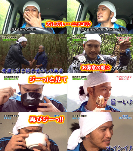 リーダー、頑張ってましたね~!ゴボゴボ言いながら潜ってる姿に、泪が出そうでした。本人はウケ狙いもあるんでしょうけどね…。その努力が報われて、アサリが順調に増えていってくれるといいな♪で、ツインタワーによる食材探し。過去VTRは達ちゃん、太一&マボ。智也とリーダーは無かったっけ?マボの「ウナギ食べれなくなる…」っていう乙女発言、よく覚えてるなぁ。せっかくの沖縄&奄美大島、天気はイマイチで残念だったね。潜ってたのは、やっぱりマボだったか。さすがだね~。今は達ちゃんの方が多いけど、マボは年季が違うもんなぁ。デッカイ魚を見つけても余裕。でも大きさを伝えるのには興奮してた?こういうトコ、TOKIOは、ホントにたくましくてカッコいいよね!!!!!智也も負けずに泥の山を「恥ずかしがり屋さん♪恥ずかしがり屋さん♪」とルンルン♪ q(^-^q)しながらシャコ探し。…もう、可愛すぎるっ!もうすぐ33歳なのに!こんなにヒゲボーボーなのに!ゲットしてのドヤ顔、ナンか、間違ってます(*'ー'*)♪茹でたての、身がたっぷりのカニのハサミを目の前にして、食欲に勝てず、持ち上げて、アツっ!と。お椀をこんなにガン見して飲む人、あまり見たことないよね?あまり怖い思いもせず、美味しい、温かいものが食べられてヨカッタ♪