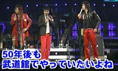 すっごく期待して、その分、不安もあって、ホームなんだけど、いつもと雰囲気の違う武道館に…o(;-_-;)oドキドキ♪して。事前情報で2番目(辺り)と聴いてたけど、トップバッターのいきものがかりが終わって、セットチェンジをし始めると、出てくる器材に、1列目にもかかわらず、双眼鏡で楽器チェック。ドラムが紫だし、何しろ、台の上に乗ってるから、間違いなくTOKIOだろうと思ったら、太一のキーボード(ステッカーがいろいろ貼ってるあるから)が出て来て確信。セットチェンジの間にステージ前のDJブースでDJが音楽かけてくれたり、モニタにテレ朝の番宣が出たりするんだけど、LIVEを待つ前の(((o(^。^")o)))ワクワク感で智フレ達と何が1曲目かな?とか、衣装がどうかなと落ち着かない。ブラスの方たちが登場して、目の前にクニオさん発見。アレ?トランペットがナベさんじゃないのか?と思ってると、スタッフも楽器チェック開始。ナニやら人数多いし、ナンかギターのフレーズが、智也みたいな弾き方だなぁ?と思って、双眼鏡ガン見。アレ?尻尾がある!…智也だっ!!え?ナンで?…隣のハットは…達ちゃん!?Σ(゜□゜(゜□゜*)ナニーッ!!?すると、智也の隣の髪がスゴいことになってるのはもしかして…リーダーじゃん!!??ナンでスタッフに紛れてるの?気付けば、スタッフが着てるTシャツ、目の前のカメラクルーとか、他のスタッフTシャツと違って、グッズのTシャツじゃん!慌てて、みんなに「メンバーがいる!」と教えるも、ナンでど真ん中の人達は騒がないのかな?と思ってると、キャーという声が上がり始める。やっと気付いたのか。場内が騒ぎ始めると「One、Two、One、Two」とマイクチェックしてる智也の「よし、いっちゃおう!やっちゃおう!」という合図で、宙船のイントロキタ━━━━(゚∀゚)━━━━ !!!!!( ̄△ ̄;)エッ・・?こんな始まり?ととまどいつつも、久々のMusicianTOKIOにテンションアーップ!だって近いんですもの♪でも、衣装はグッズTシャツってことですか???それにしてもイントロ、いつもと違うんだ。…カッコいい~!すぐに歌いださないで何フレーズか弾いてるの。でも智也が歌い出すと、スゴい歓声!1フレーズ歌い終わった後の間奏で「We are TOKIO~!」と智也が叫ぶ!あぁ…カッコいい!…髪の毛しばったままだけど、前髪ひとすじパラりがたまりません。リーダーが目の前だけど、ニコニコだぁ♪ブラスは倍の人数なのね。リーダー側にクニオさん他3名、太一側にナベさん他3名。ストリングスはないみたい。宙船終わりに智也「はははぁー!」って笑ってる。そしてすぐに達ちゃんのベースソロフレーズ。チョッパー、バリバリ。リーダーも加わり、シブい~!で、一旦フリーズ。バックライトを浴びて静止してるシルエットがカッコいいぞー!すると、「WATER LIGHT」に突入。達ちゃん&太一が大きくステップ踏んでる。懐かしいね~!DVD見た後だから、余計になのかな。でも、このジャンプ…シンドイ…。リーダーが一生懸命飛んでるから、頑張ったけどね。でも2番では途中でリーダー、ヘロヘロなジェスチャーして諦めました。目の前の花道にリーダーが来てくれて、ホント近い!!!で、ニコニコ笑顔にトロけます…♪後半、リズムが乱れちゃって、残念。ココでも智也笑って〆てる。そして今度は智也のギターフレーズ。ん???聴いた事ある感じに繋がって…「LOVE & PEACE」だぁ!フリがまた出来ると思わなかったよー!誰だー?歌う場所で歌わなかったのは!…達ちゃんか!?久々だけど、ちゃんと練習したんでしょ?でも久々のフリが楽しくて嬉しくて。こういう時1列目だと他の人の反応が見れないのは残念だなぁ…。贅沢ですが。ブラスが加わると、またいい感じに盛り上がるね。智也が歌う時、コッチ側に顔を傾けて歌うので、(*^m^*) 目が合っちゃう(気がする)♪で、ココで智也の遊び心?ラブピの間奏で♪僕らの自由を~僕らの青春を~♪って、奥田民生さんの「イージューライダー」のフレーズを歌ったの。私は智也に釘付けだったけど、智フレはリーダーが笑ってたって言ってました。民生さん聴いてくれてたかなぁ?智也がところどころ、叫んでるのがノッてるんだなぁと嬉しくて。そしてマボのスティックカウントで「ALIVE-LIFE」。SUGARツアーでのブラスの皆さんとのカラミを思い出すよ…。…ん?そういう意図なの?うーん、リーダー、ギターが残念なことになったぞ?ブラスの皆様とステップ踏んでノリノリなのは、嬉しいんですけど、本業頑張れ!ココでMCが来るかと思ったインターバルだったのに、そのまま続けてギターを弾き始める智也。(゜∇゜ ;)エッ!?「LOOP」行きますか???ファン的には久々でイイのですが、あまり知らない曲続けるのは、他の客は大丈夫か?(後でトキフレに聴いたけど、やはりココらヘンで座っちゃった客多かったらしいです…)今日は智也の歌い方も気にならないなぁ。ガナる感じが随分なくなったよね。智也とリーダーのツインギターフレーズが素敵♪そんな余韻が「LOVE YOU ONLY」イントロでぶっ飛ぶっ!6曲め