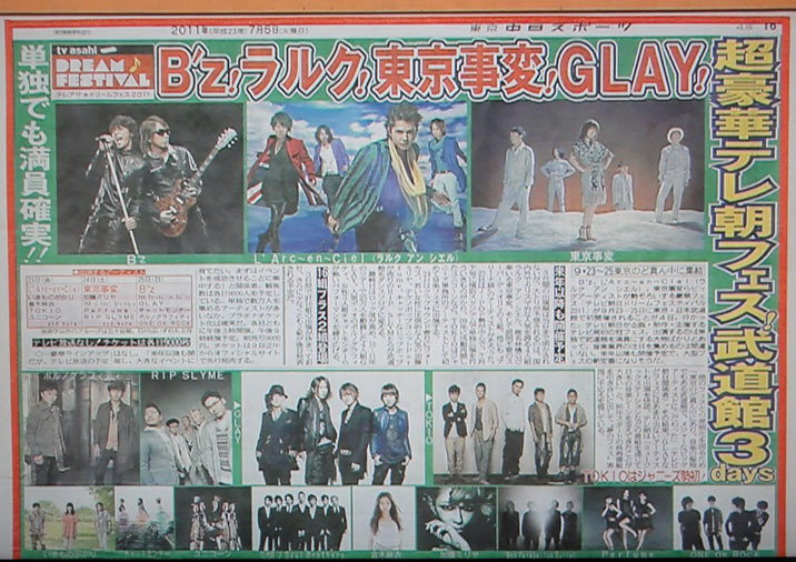 いきなりビックリ(ノ゜⊿゜)ノしたよぉー!テレ朝主催の音楽フェスにTOKIOが出るってニュースが出た!ジャニーズ勢として初だそうだけど、慌てるっ!3日間、武道館で開催らしいですが、TOKIOは初日の9月23日(L'Arc~en~Ciel/いきものがかり/倉木麻衣/TOKIO/ユニコーン and more…)に登場。ただ、その中で、出演順が当日発表ということらしい。というか、各日9000人しか入れないようで、チケットが取れるのか…という不安が。こういうフェスって、FCの番協みたいな枠があるのか、分かんない。テレビ放送がないんだから、行きたいじゃん!…ホント、また落ち着かない日々になっちゃうよー!