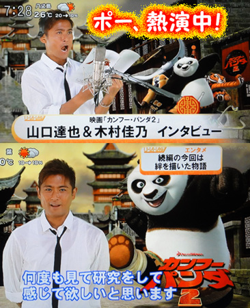 同映画は、2008年に大ヒットしたアニメーション映画の続編。オリジナル版ではジャック・ブラック、アンジェリーナ・ジョリー、ジャッキー・チェンらが声優を務める。映画について山口は「前作よりさらにクオリティが上がっていて、よりポーに親近感が沸いている。もし、ポーのようにカンフーの達人になったら、友達のジャッキー・チェンと闘いたい」などと話していた。8月19日(金)より東京・新宿ピカデリーほか全国デジタル3Dロードショー。