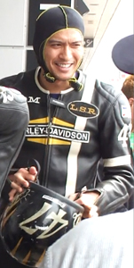 遠いし、行けないなぁって思ってたのに、New「47」の画像見ちゃって胸がザワザワ。諦めるつもりでアクセス見たら、ん?つくばより交通の便はいい??って思ってきちゃって…ヾ(´ε`*)ゝ 行ってきちゃいました。「やっぱりね」って声が聞こえてきそう…(;´▽`A``ところが甘かった!レース場へ行くバスへ乗ったまでは順調だったのに、そこからが散々。足、棒になりました。パドックへ着いてからも、ドコ?と出走準備時間が迫る中、ドキドキしたけど、ナンかやっぱり呼ばれる感じ?がして歩いていくと、お仲間発見。ココのパドックは建屋内なんで、皆さんいるところが暗い。うーん、ココはあまり長い時間、じーっと見ていられない場所かも…。智也の姿がないなぁって思って、キョロキョロしてたら、いきなり、キャップかぶってバイクに乗って智也がキタ━━━━(゚∀゚)━━━━ !!!!!ニッコニッコの笑顔で仲間の元へバイクを寄せてきた。いきなりの登場で、喜びのあまりカメラ出し損ねて、見送っちゃったよ。ナンか最初見えた時、顔がシュッとしてて、一瞬、智也だよね…?って感じだったの。すぐに着替えを始めて、またパンツ姿見ちゃった…。