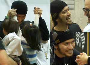 子供と話してる智也、断片的に耳に入って来た単語に「怪物くん?」「20年後に~になってるから」(と自分を指しながら)。「怪物くん」話はナンだったんだろ?その子の両手を持って持ち上げぶらぶらさせて遊んであげてる智也。「可愛い~♪」連発。しゃがんで子供と同じ目線になり、優しく微笑む姿にトロケそうでした。今回、仲間内の子は女の子が多くて、優しく頭を触ったり、髪を撫でる仕草に、軽く嫉妬!!!…うらやましすぎ…!そのせいか、子供をダシにするお母さん、お父さんも多くて、その都度対応してる智也は大変。写真を頼まれて断るのに、ホントに申し訳なさそうに何度も頭を下げ、状況を理解してもらおうとしてる。悪いのは智也じゃないのに!一人許せば際限なくなって、周りに迷惑かけちゃうのがヤダもんね。まぁ、頼む方もダメ元で言ってるんでしょうが、困った顔してる智也を見るのがしのびなかったです…。智也の精一杯の気持ちが現われてるのが、断った子の頭をぎゅっと手で包み込んで、優しい笑顔で見つめてあげてるの。ホントにホントに素敵な男です、長瀬智也。
