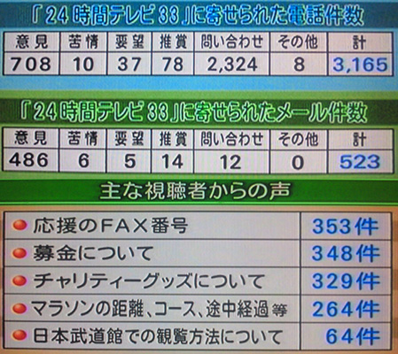 「あなたと日テレ」の中で24時間テレビが取り上げられてました。24時間テレビ事務局長とバラエティ局チーフディレクターが出演。こういう番組やってても、結局は自画自賛。寄せられた内容の内訳を「意見が~件、その他要望、問い合わせ、その他」って、「苦情」だけは言わない。視聴者からの意見の紹介でも「とても感動しました」と、ヨカッタという感想を読みあげてる。コレ、意見じゃないよね?余韻に浸りたいのに次の企画に行ってしまった事に、詰め込み過ぎでは?という意見を取り上げてたけど、それに対しての制作者側の回答は「貴重な意見として今後の番組作りに生かします」というお決まりの言葉。「いろんな障害や病気を抱えてる方がたくさんいて、出来るだけ多く紹介しようという気持ち」と言ってるけど、それが詰め込み過ぎって言われることを理解してないんだよね。苦情の内容も発表するくらいの気持ちはやっぱり無いし、結局は変わらないのね。