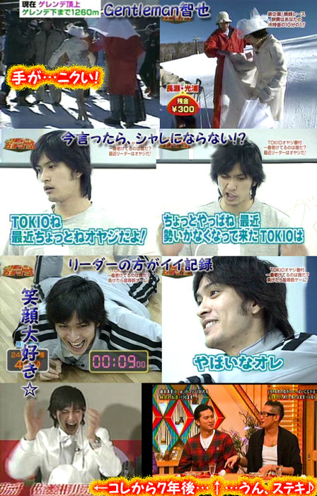 某掲示板で出てた「ガチンコ!」ネタ。やっぱり見たくなって見ちゃいましたよ。そして同じディスクに入ってた他の回も合わせて見ちゃった。2003年1月2月頃。ちょうど初TOKIOライブの直前だったから、「オヤジ番付」最下位のリーダーへの罰ゲーム、オーラスをパンチパーマでっていうのを、ある意味楽しみにしてたのに、やっぱり、やらなかったのよね~、当然ながら。MCでも全然触れなかったから、ナンで?と思ったことを覚えています。「5LDK」智也の声を聴くチャンスが少なかったね~。。「チョー大好きなナンだね~♪」言い方が可愛かったなぁ~♪ゲストは上3人の方ばかり向いて話してたけど、話しやすいから??