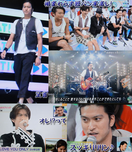 夏だからなのか、各グループの動きが活発で、いろいろ焦ります。「ザ・ミュージックアワー」になってから、まともに見たことないんだけど、「うたばん」同様、時報直後の演奏シーンのみよね?13日のMステは、SMAP、TOKIO、嵐と、5人組3グル―プ出演にオドロキ。それぞれ絡んでくれると楽しいんだけど。腰痛持ちの先輩の代わりに、太一、踊ってみれば~!? で、まさかの、プロモ、テレ朝が一番出し。惜しかったね~、J-Net。昨日、褒めてみたけど、やっぱりか。それにしても、扱われ方、ヒドくない?TOKIOくん達の並び方も、ナンかビミョーだし、撮影してるカメラは1台はともかく、もう1台はメイキングを撮るようなカメラっぽいし…。まぁ、取り上げてくれること、5人一緒だってことで、赦しちゃうけど…。7/17のマボラジオで語ってたことを言ってた(ラジオテキスト参照!)けど、すぐ出来たとは言ってたけど、4、5時間だとはビックリ!! パワーの源は?という質問に智也は友達、太一は外で遊ぶこと、マボはシャワー後のビール、達ちゃんはロケ弁。スタジオでは爆笑でした。そして、リーダーは「メンバー」。「メンバーといると、みんな元気だから」(*'ー'*)ふふっ♪太一から「ウソつけ!」と小声でツッコミ、達ちゃんは「今日、大して、話してねぇぞ!」マボ「No Soul(魂がない)!」と散々なリーダー。これもTOKIOスタイル♪来週のズームやめざまし、ブランチと、楽しみだよん♪