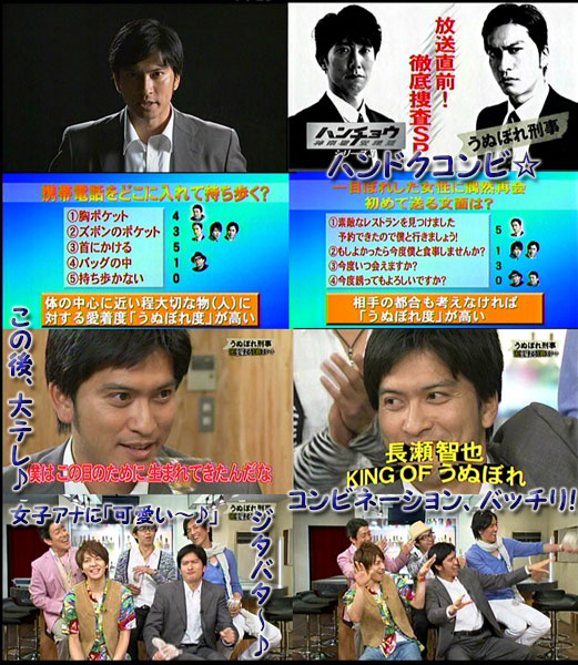 ナビ番組!(*´ο`*)=3ハァーやっぱり、盛り沢山でもうo(>_< *)(* >_<)o ジタバタです。オープニングから“o(* ̄o ̄)o”ウキウキ♪そしてハンドク!を思い出す2ショットまで。って、コレは番宣ですから。ドラマ内容紹介は、まぁ、本編を見ればOKと思うので、スッ飛ばします。で、うぬぼれ5の中からうぬぼれKINGを決めるという心理テスト?携帯をズボンのポケットに入れるのは、普通だよねぇ、とツッコミしながら。最初、カバンに入れると回答を「今のカバンが入れやすいんで入れてるけど、普段は胸ポケット」と三津五郎さんが言いだすと、すかさず智也が「じゃ、そっちにしてください!」ってツッコんでます。女子アナの「うぬぼれKINGはダ~レだ!」っていうフリに「可愛い~!!」とジタバタする、うぬぼれ5ですが、その中でも、三津五郎さんが「か~わ~い~い~!」ってイマドキの言い方をしてるのにも、「三津五郎さんが一番言ってる!」と大喜び。もうコンビネーション、サイコーです。やっぱりバーのシーンは、ツボになりそう♪智也が食事選ぶのが幅広いって自己申告してたけど、行くとこ、決まっちゃってなーい??そして、KING of うぬぼれに選ばれて「うぬぼれてる意識は全くないんですけどね~」という智也にカウンセラーさんが「そこがスゴくうぬぼれていると思う。無自覚な事ほど、罪深いことはない!」とバッサリ!!そうそう!自分がカッコイイってこと、無自覚(じゃないとは思うけど)なことは、罪深いよっ!里恵の車の前に飛び出たシーンで、ナンバープレートが映ったんだけど、「1107」って、コレ、狙い!?