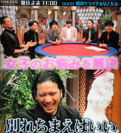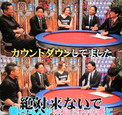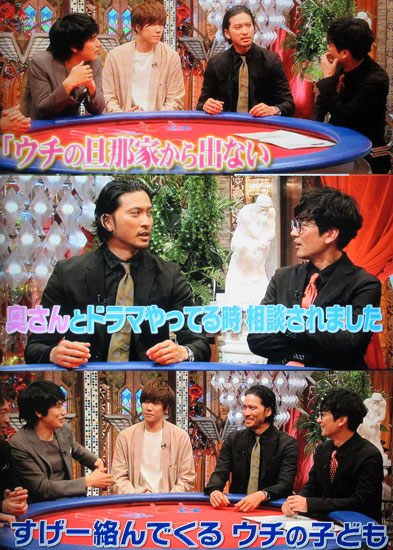 米倉氏に「面白いんですよ!」って「23区23時」企画の説明する智也。ツイ観てると、一般視聴者にはウケがイイみたいで、参るね…。ゲストさんは、あまり興味を示さなかったようですけど。ま、当然よね、ゲストを放っておいてVTR観てるんだからね。…こんなモヤモヤをTOKIOは拭ってくれるんだよね~。予告では、ゲストがアレコレ言われてるのを、全員爆笑してたかのように編集されていたけど、散々裏切り話をぶーたれていた人が「痩せたい」と言った言葉に爆笑してたんじゃん!リーダーのマボ接待は、智也&太一の大好物♪こういうトコ、すっと出てくるリーダーも凄いと感心しちゃう。で、懐かしいなぁ~、「梨乃姉」のマネ。夜王で共演した2006年のLIVEのMCで何回も聴いたような。智也もマネしてたよね!?でもマボの言ってる女優という女優っていうのが理解出来ない…。障害物リレー、楽しみだけど、13回目の出演が、近くないように…(自粛)。