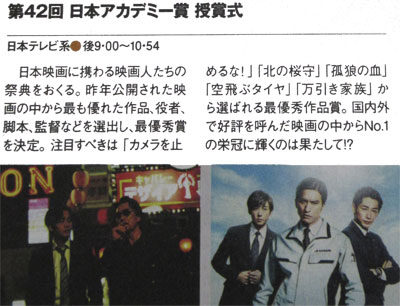 日本アカデミー賞授賞式の事前番組をやっていて、録画をしたんだけど、助演賞の紹介で、どちらにも、やっぱり赤松社長は出てくるよね。そして作品賞としても紹介されて。…主演男優賞の紹介では過去受賞者の岡田氏やニノのスピーチが流れ、胸がキュッとなる…。こういうスピーチを智也がする事になるかも!?って、期待してたんだけどね…。作品賞~☆ 主演は #長瀬智也 #空飛ぶタイヤ 第42回 #日本アカデミー賞授賞式|日本テレビ https://t.co/wqthV44cNE pic.twitter.com/rPdcrhImej