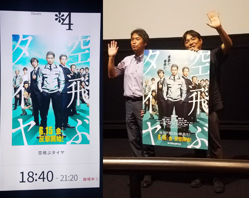 週末の決まり事、「空飛ぶタイヤ」鑑賞。丸の内ピカデリースクリーン2になったので2階席~って思ったら、お昼の回は、最前列真ん中はほぼ埋まっていたので、朝10時の回を選択。男性一人客数名とご夫婦数組の2階席。公開1ヶ月過ぎ、日曜早い時間の回だから、もっと少ないかと思ってたので、やはりヒットしてる感じを体感するなぁ。そして、この2階席最前、もう、スクリーンが近くて近くて。手すりギリギリまでスクリーンなので(視界では)、智也がアップになったら、ホントに目の前に顔がバーンっ!て出てくるから、キャ━━━(*´∀`*)━━━ !!!!!ってなっちゃう♪もう十数回観ていても、やっぱり(≧∇≦)キャー♪って。観終わってすぐ、またZettai、ココでギリギリまで観る~!となりました。今日は、事故現場でのシーンが気になって…。夜のシーン、2人を正面で映してる時、目の前(カメラ前)にネットがあるんだよね~。でも、他の事故現場シーンでは、そういうネットは張ってないんだよね~。夜のシーンが、あそこでの最初の撮影だったのかなぁ?それにしても、何度観ても、腹立つのよね~、大阪の黒田運送のオヤジ&ホープ銀行の小茂田!!ふと、以前の切り抜きを観てて気付いたけど、田口浩正さん(相模なんちゃらの課長さん)が謝りに来るシーンがカットされてる~!「日本映画Navi」とか「Cinema Square」で、「現場リポート」っていう形で取材入ってたヤツ。「ここ、芝居をやり過ぎて編集でカットになったりしないですよね?」って田口さんのコメント載ってるけど、まさか、ホントにカットされてるとは!ムロさんだけじゃなかったんですね~、編集に泣いた人…( *´艸`)。