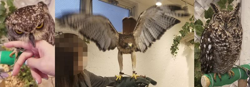 竹下通りを通るのがヤダから、表参道へ出ようと歩いてる時、ふと、そういえば、「おしゃれイズム」で智也が行ったフクロウカフェが、この辺だって、思い出し、まだ時間があったから、行ってみました。ちょうど、5、6人の客が帰る所だったので、店内には2人組の女性だけ。高校生の頃、合宿所の隣の民家の庭に飼われてたフクロウを観て以来、大の猛禽類好きなので、ホント、来たかったんですよね~。テンション上がるなか、いろんな子を撫でてみました。想像はしてたけど、それ以上にフワッフワ。1羽、今日は触れないコがいて、扇風機にあたってる状態だったのを除けば、全部に触れて、腕に乗せられて。