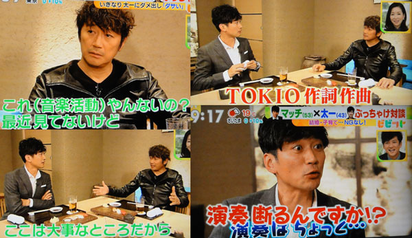 このダメ出し見てると、2014年2月、マッチゲストのトキカケでOA無かったヤツを、ますます見たくなる。【「『TOKIOが何をやりたいのかさっぱり分からない』と苦言を呈した近藤真彦は2014TOKIOに対し、メンバー1人ずつカメラに向かって今後の夢を宣言するよう要求する」】2月だから、20周年に向けての活動が始まる直前だったんだろうけど、その時点でも、こういう風に言われたんだから、この現状については、やっぱり、言いたくなったって事かな。どこまで、把握してるか、判らないけど、ツッコんでくれる先輩がいることには、感謝。