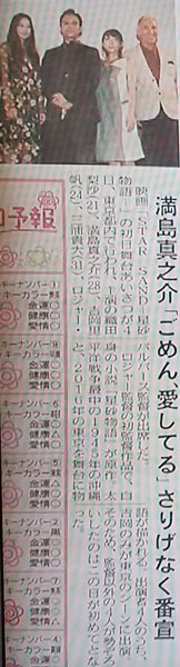 って、ナンか、話がズレていったけど、このところ、ナンか、いろいろネタがあって、書きたいことは山積みなんだけど、時間・体力・精神力の問題で、どんどんたまっていく一方。昨日のトキカケ。あまりトーク番組で見かけないような気がしたけど、そんなに喋りにくそうな印象ではなかった記憶でしたが、いろいろ喋ってくれて、楽しかったなぁ。芸歴20年っていう事もあるのかな。個性的で、好きな女優さんだけど、智也とのお芝居での相性が、ビミョーかなって、ちょっと思ってたんだけど、どうかな。「まぶしい顔選手権」、コレでしょ!すぐ、思い出したよ、この、律の仕草♪ 気になったけど、ナンで「達也にいにい」って、親し気⁉共演あったっけ?雑誌・サイト予告のほとんどがOAされたけど、「沖縄流TOKIOメンバーの名前の呼び方も必見!」ってヤツ、出てないよね!?必見!って書くなら、OAしてー!