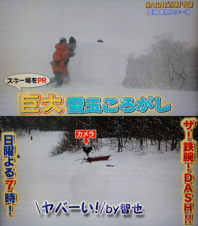 誰が誰だか、解らない映像で、どうやら、助っ人ゲストがDASHゼッケン(?)着けてる?智也の「ヤバーい!」という声が響き渡ってるけど、カメラ、OUTよね…!「【ご当地PR課】は、“巨大雪玉転がし”が2年ぶりに復活!今回の舞台は日本一の降雪量を誇る岩手県のスキー場。松岡さん&長瀬さんは、パウダースノーが固まらず大苦戦」ってあるから、大変だったのは間違いなさそう…!