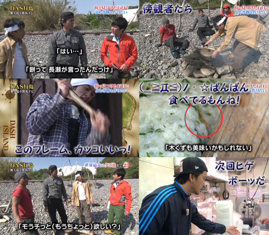 メンバーに話しかけられて「はい」って返事する智也が大好物です♪特に達ちゃんや太一に返事するのが好きです♪末っ子というか、後輩モードがたまりません☆そしてやっぱり不思議な時系列。ヨモギ餅を食べたのは、一体いつなんだ?臼を見つけてから、かなり時間が経ってるんだよね?もち米を用意した時点では、リーダーがヨモギを見つけた時より、ヨモギがたくさん生えてるってことだから。(-ω-;)ウーン…。ま、いいや。持ち込みもち米を蒸かして、お餅を作る作業は、ホントに完璧!こうやって作業することを、村に絡めて、いつも寄り添ってる感を出してるのは、いいことだよね。全部彼らの経験値なんだから。ところが、DASH島でも「木くず」に悩まされるTOKIO。(^ー^* )フフ♪これでまた味を覚えた(?)から、マチガエテーラは大丈夫ねd(゜ー゜*)!