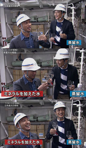 リアクションと言えば、太一と二人で造水施設見学は、やっぱり波長が合う2人ならではのリアクション。リボンが巻かれたグラスで乾杯し、飲んで目をキラキラさせて見つめ合う2人がカワイイよー♪ミネラルを入れるって言ってたけど、どうやって??というのが母と一緒に観てた時に疑問だったのですが…。操舵室でも、少年のようにウキャウキャしてるTOKIOがカワイイね~。TV誌に出てた、5人のジャンケンって、ココで出るかと思ったのに、無かったなぁ…。船長さんの椅子に座ってるマボの画もないのね。その代わりにマカオでポスターで登場!?(*'ー'*)ふふっ♪