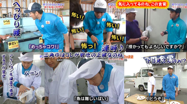 今朝の達ちゃんラジオで日本ダービーの事を話していましたが、智也が緊張してないって言ってたけど、智也自身は緊張したって言ってたよね。だからこそ、みんなで背中を叩いたんだもんね。 で、今日のDASH。番組まるまる智也&リーダー。今回も食材ゲットはスムーズに行って、またまた豪勢な数々の食材。スゴいなぁって思ったのが、道の駅で、いろいろ見てる智也が、「トマトとかあったらイタリアンとか出来るし」って、発言してるんだもん!ホント成長したのねぇ~。キッチンカーでは、これ以外のかぶり方はしないって決めてる風な、いつもの三角巾。「ガバッてきて、バーン!」智也のお料理は賑やかで楽しいね。「おじゃましまーす」可愛すぎる。成長したかと思いきや、ヒヤヒヤの庖丁使い。リーダーも慌ててたね(* ̄m ̄)プッ大事なギタリストの指、怪我しちゃマズいもん!でも、綺麗にイカに切れ目を入れちゃうからサスガね。食材提供の方々を呼び込むのに、方向見失ってる智也が可愛かった☆